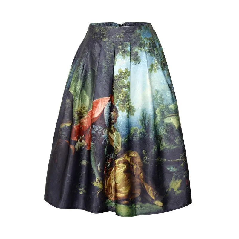 Dieser Rock im Swing-Stil hat ein Plissee-Design. Hochwertiger Stoff und Ölgemäldedruck einer atemberaubend schönen Prinzessin machen es einfach, mit jedem Outfit zu kombinieren. A-Linie ausgestellter Rock. Stretchmaterial für eine bequeme Passform. Dieser vielseitige Rock ist ein Muss für ein tolles Outfit. Es kann zu jedem Anlass durchgeführt werden: Schule, Büro, Verabredungen und Partys. Ein schmeichelnder Rock, eine hohe Taille und eine A-Linien-Silhouette lassen Ihren Körper schöner aussehen, und die weite Rocklinie erzeugt einen wunderbaren Fluss.