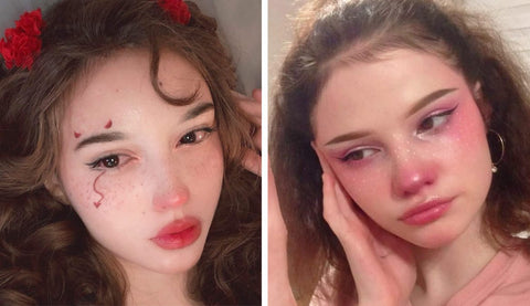 Babyrosa Nase, scharlachrote Wangen, kräftige Toffee-Lidschatten und Sonnensprossen (auch die falschen) sind ein Hinweis auf Jugend und Emotionalität in Ihrem Look. Dies ist eine stabile Basis für ein eGirl-Make-up.