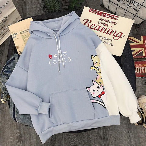 Baggy, süß, gemütlich und gut aussehend? Bei diesem Hoodie dreht sich alles um. Niedlich, mit Katzen und mit Pastellfarben. Solch ein ästhetischer Hoodie kann Sie im kalten Winter warm halten und Ihnen mit seinem weich aussehenden Design etwas Charme verleihen.