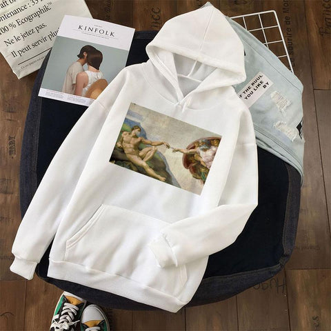 Stellen Sie sich das weltbekannte Gemälde „Erschaffung Adams“ auf Ihrem Hoodie vor. Um es noch moderner zu machen, haben die Designer eine Maske hinzugefügt, die wirklich das Symbol dieses Jahres ist. Dieser weiche weiße Hoodie wird überall auf sich aufmerksam machen.