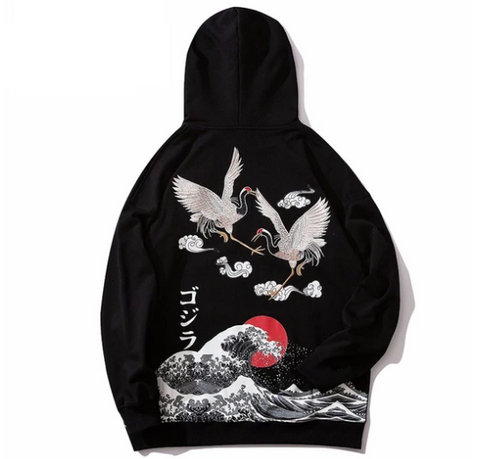 Schwarzer Hoodie mit Kranichen, Sonne, Hieroglyphen und Meer wird von jedem geliebt, der eines Tages davon träumt, nach Japan zu fliegen. In der Tat ästhetisch, mit seinen Motiven, wird es jedem Stil Charme und Einzigartigkeit verleihen.
