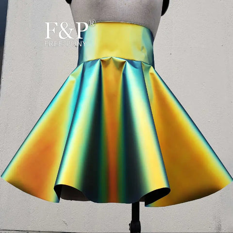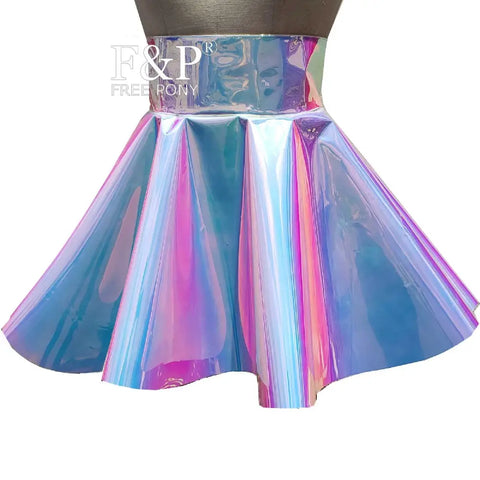 Holografischer, schillernder PVC-Rock mit hoher Taille in Regenbogenfarben
