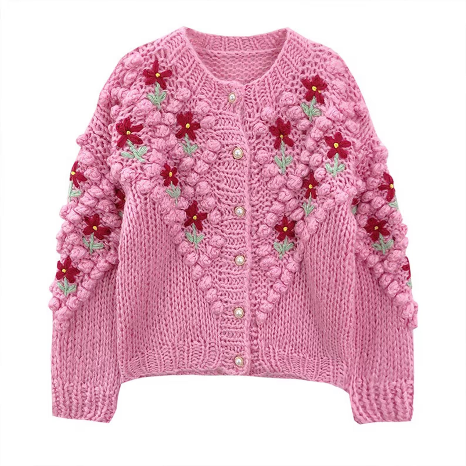 Pink knitted floral cardigan with white skirt, featuring a textured design and embroidered flowers.