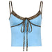 This cropped cami features a unique design with leopard patchwork detailing, adding a stylish touch. It has color block spaghetti straps and a self tie-up front, allowing for an adjustable and comfortable fit. This versatile tank is ideal for various uses, whether as lingerie, sleepwear, or a casual top.