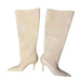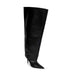 These over-the-knee slip-on boots are made from PU material and feature a pointed toe. The design offers a sleek profile with a thin heel. They are designed to slip on for ease of wear and have an 8cm heel height. These boots extend over the knee for a distinct silhouette.