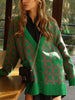 Model wearing a Knitted Oversized V Neck Long Sleeve Cardigan in green with white patterns, paired with wide-leg pants and matching bag