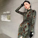 This long floral vintage slit dress is designed for comfort and versatility. It feels silky and smooth against the skin, making it suitable for both casual outings and more formal events. The dress features a thigh-high slit, which pairs well with high heels for an elegant look.