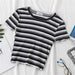 This top is crafted from a blend of cotton and polyester, offering a comfortable feel and durability. It features short sleeves and an O-neck collar, providing a classic and easy-to-wear design. The striped slim fit is intended to be flattering while allowing for comfortable movement.